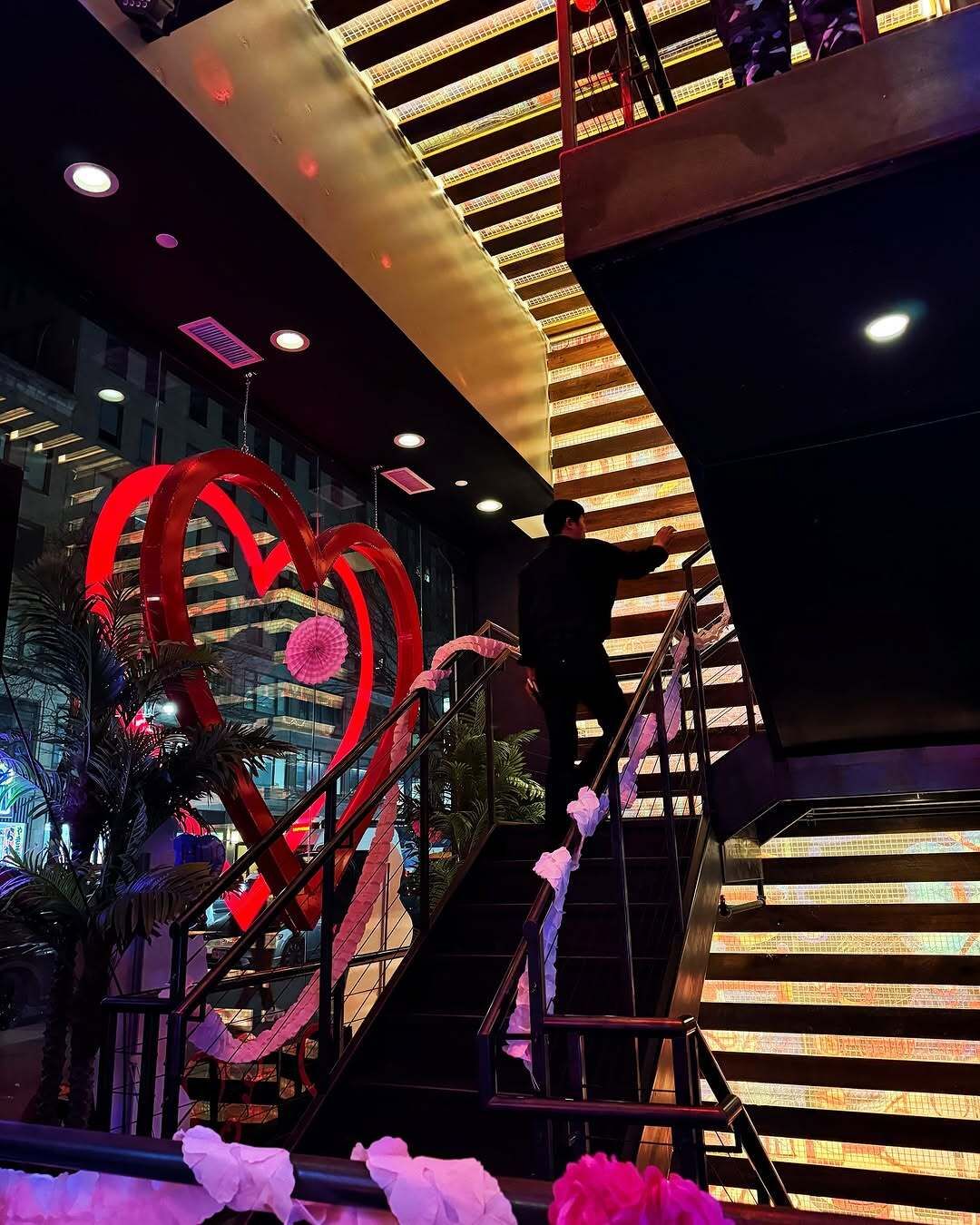 LOVE leans hard into its nightlife identity. The decor is sleek and modern – wooden tables with built-in grills, black tile walls, and neon hearts, K-pop art, and LED lighting everywhere. Each floor has its own vibe: the main floor is bustling, the basement has bar/lounge seating, and the top floor can be reserved for private events or large parties.